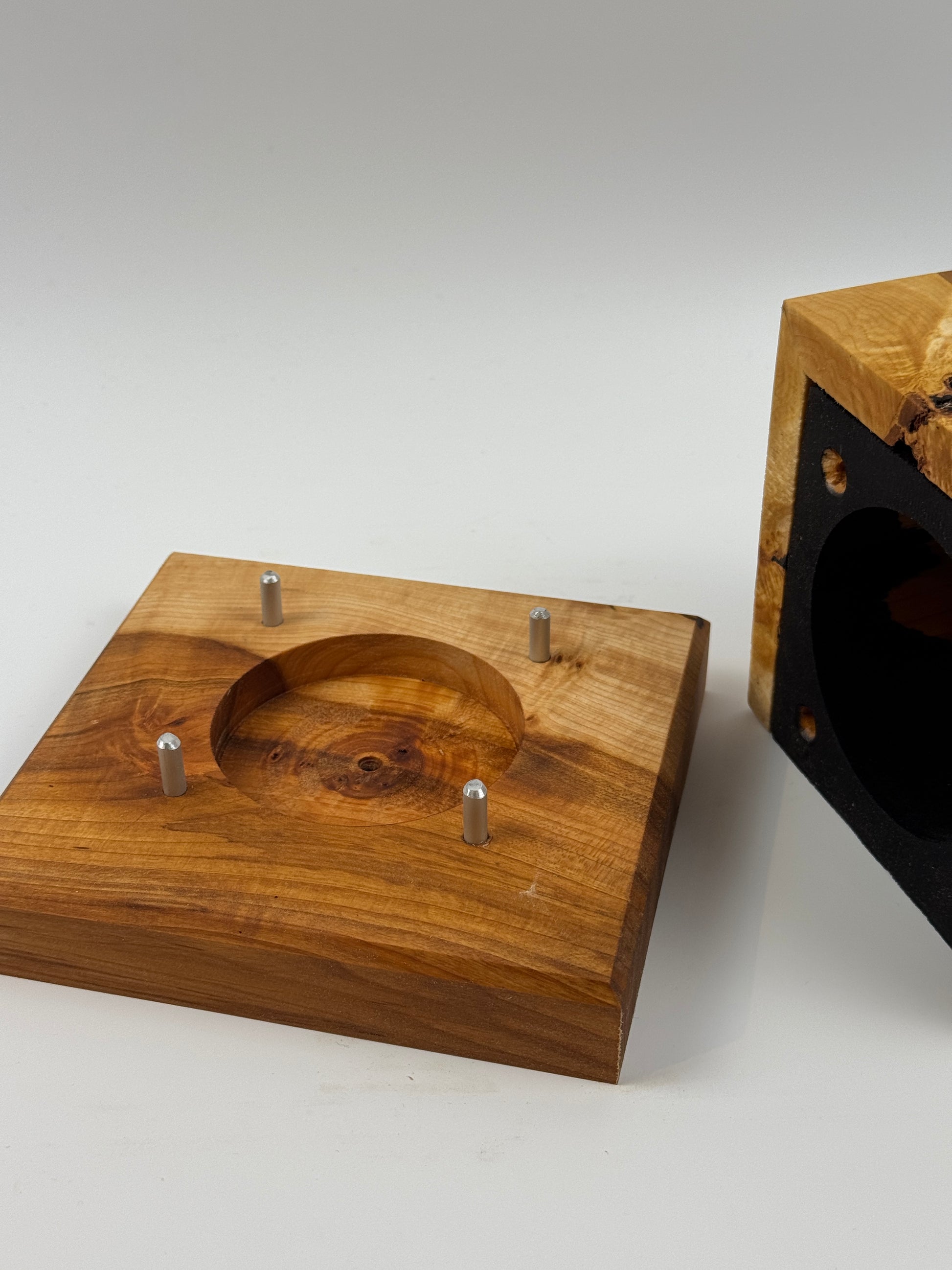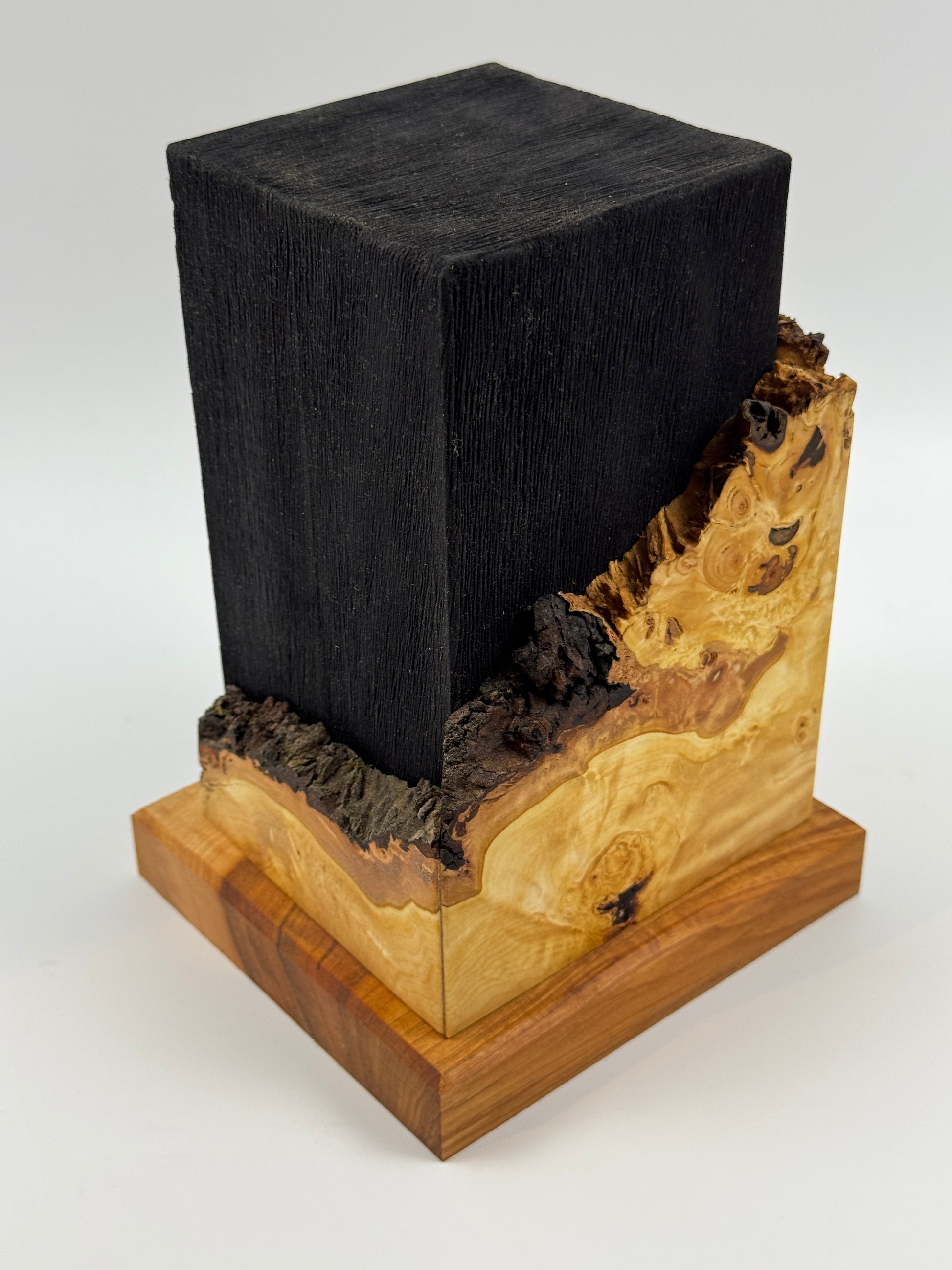 Urne aus schwarz gebeiztem Lindenholz mit einer Umrandung aus Lindenmaser.